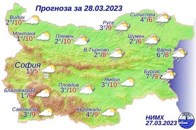 Утре валежите ще спират и облачността ще се разкъсва и намалява, но по-значителна ще се задържи над източната половина от страната и там ще има превалявания от дъжд, на отделни места в Североизточна България - дъжд и сняг. Ще е ветровито с умерен и силен вятър от запад-северозапад, който привечер постепенно ще отслабва. Минималните температури ще са между 1° и 6°, а максималните - между 5° и 10°. В София минималната – около 1°, максималната – около 5°.