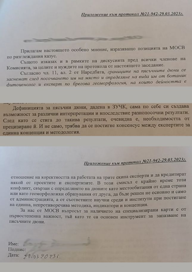 На проведено на 29.03.2023 в Бургас заседание на Комисия за приемане на специализирана карта и регистри на пясъчни дюни, разположени извън морските плажове „Каваците – Север“ и „Каваците – Юг“, землището на гр. Созопол, община Созопол, единствено представителят на Министерство на околната среда и водите (МОСВ) изрази особено мнение и несъгласие по отношение на разгледаните по време на заседанието материали и данни, свързани с местоположението и вида на пясъчните дюни.