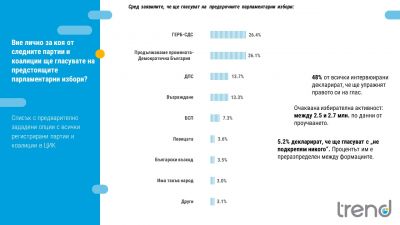 5.2% посочват опцията „не подкрепям никого“. Резултатът от тази опция е преразпределен между всички формации, тъй като той не участва в крайния изборен резултат при парламентарни избори.