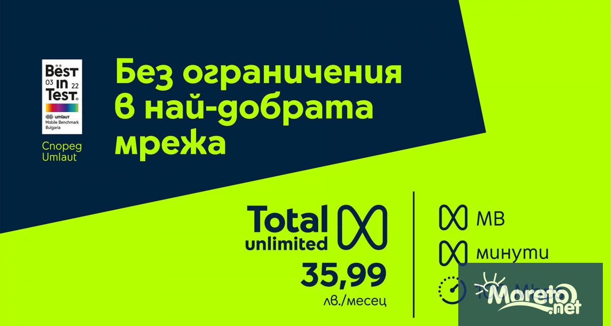 Благодарение на плановете Total Unlimited клиентите могат да разчитат на най-добрата мрежа с 5 поредни Best in Test сертификата от umlaut, неограничени минути за разговори в България и роуминг в ЕС, както и с неограничените МВ в страната на скорости, започващи от 100 mbps за Total Unlimited 35.99 и достигащи до неограничена скорост при Total Unlimited 59.99.