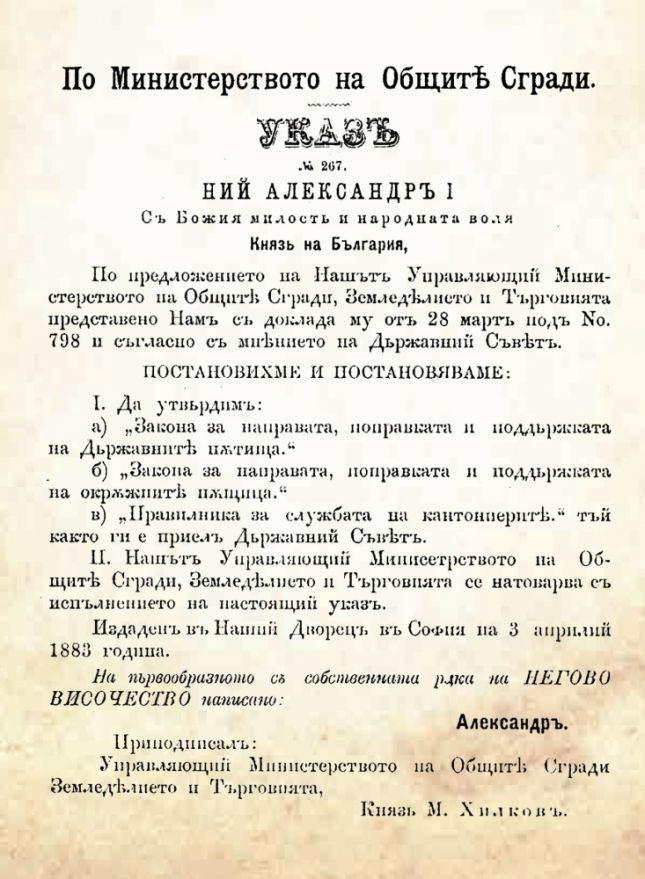 С указа се утвърждават законите за направата, поправката и поддръжката на държавните пътища и на окръжните пътища, както и Правилникът за службата на кантонерите. С първите държавни документи за проектиране, строителство и поддържане на пътищата в Княжество България за първи път се регламентира пътното дело у нас. Двата закона са изработени от княз Михаил Хилков, който е бил управляващ Министерството на общите сгради, земеделието и търговията (МОСЗТ) в кабинета на ген. Леонид Соболев. Към това министерство са били и пътищата на държавата. По-късно МОСЗТ се управлява лично от министър-председателите Драган Цанков, Петко Каравелов и др.