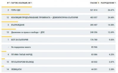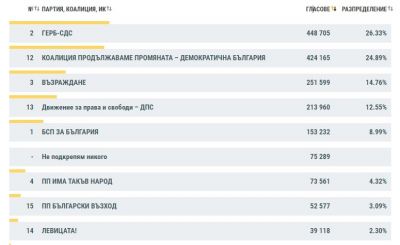 Втори се нарежда коалиция "Продължаваме промяната - Демократична България", която изостава с 1,5 пункта и е с резултат от 24,96%.