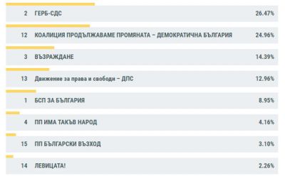 Под 4-процентната бариера за влизане и в парламента, но с резултат над 1% остават Български възход с 3,1% и Левицата с 2,3%.