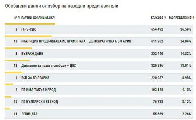 ГЕРБ - СДС имат 26,59% или с 1,75% преднина пред ПП-ДП, които получават 24,84% от гласовете. Разликата между двете водещи коалиции е 43 210 гласа.