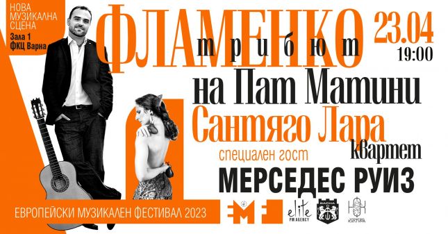 Кулминацията на Европейския музикален фестивал Варна 2023 е на 23 април с концерта “Фламенко трибют на Пат Матини” в Зала 1 на Фестивалния и конгресен център. Това е премиерното представяне за България на посрещнатия с адмирации от критиката и публиката едноименен албум на Сантяго Лара квартет. Албумът е издаден от звукозаписния гигант Warner Music, печели многобройни награди и е представян на престижни сцени като Фестивала в Херес, Фламенко биенале - Севиля, Фламенко театър Sadler's Wells и др.