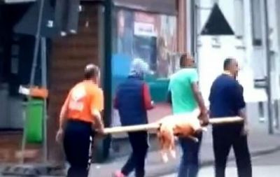 Около 7 минути мъжете са ходили в центъра на града с животното, забито на пръчката, казват очевидци.