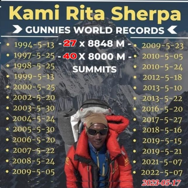 Ками Рита за първи път изкачва Еверест през 1994 г. и оттогава прави това пътуване почти всяка година. Той е един от многото водачи шерпи, чийто опит и умения са жизненоважни за безопасността и успеха на чуждестранните катерачи, които се стремят да застанат на върха на планината всяка година.