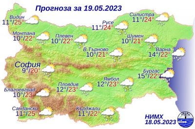 През нощта валежите навсякъде ще спрат, от север облачността ще продължи да се разкъсва, най-късно над южните райони; над Северна България ще намалее до предимно ясно време. В сутрешните часове на места в равнините и котловините видимостта ще е намалена от мъгла. Утре ще преобладава слънчево време, около и след обяд с развитие на купеста и купесто-дъждовна облачност. На много места ще превали краткотраен дъжд, придружен с гръмотевици. Ще духа слаб, в източните райони до умерен североизточен вятър. Максималните температури ще бъдат между 20° и 25°.