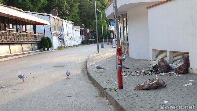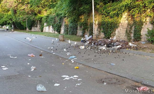 Как така 2 дни по-рано, в събота, гледката бе същата, а часът късно в 10.00 ч. Боклукът се разнасяше по алеята и бе истински бюфет за изгладнели гларуси и кучета.