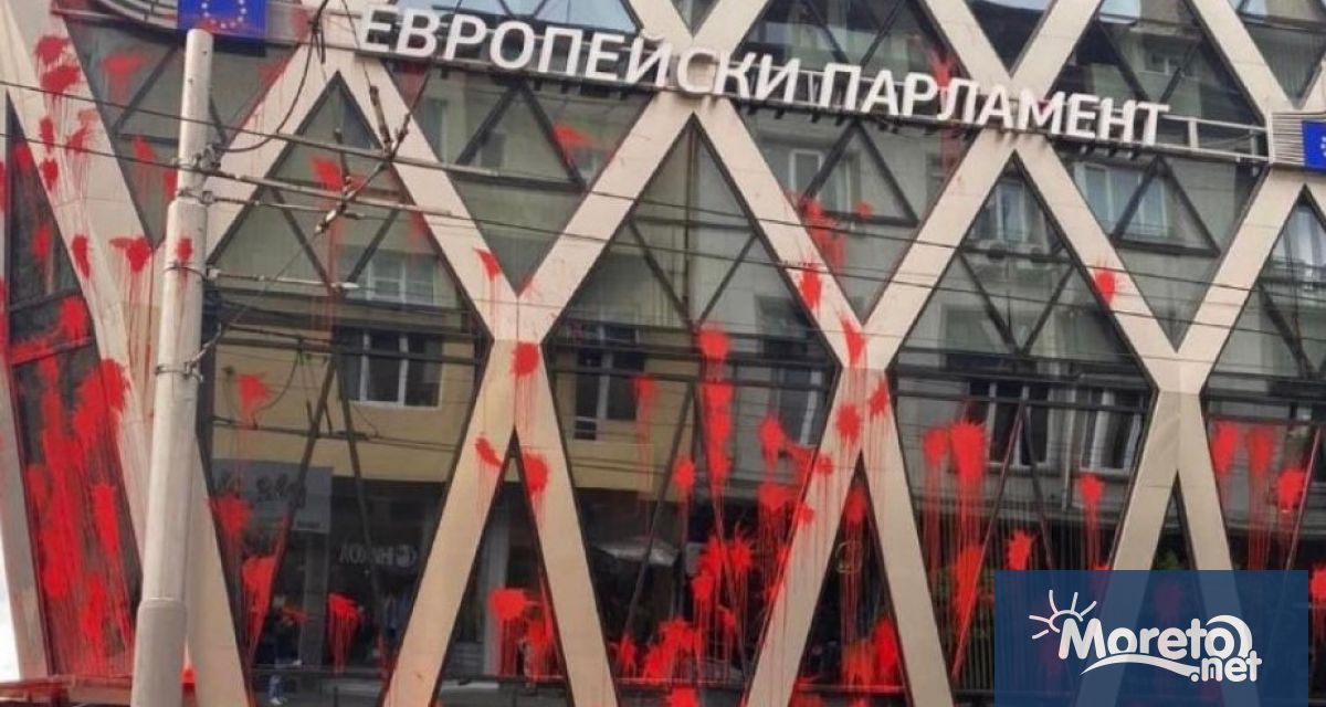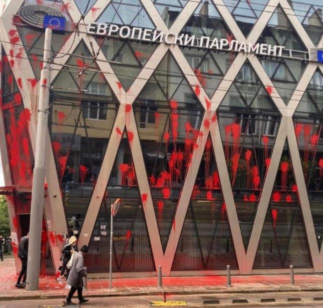 По време на вчерашния "Поход за мир", част от участниците, някои със знамена на партия "Възраждане", се отклониха от шествието и хвърлиха червена боя по сградата.