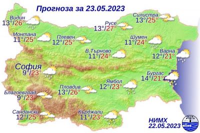 До полунощ явленията ще спрат и през нощта ще преобладава ясно време. Утре преди обяд ще бъде предимно слънчево, с по-значителна облачност над източните райони, но почти без валеж. Около обяд и следобед ще се развива купеста, главно в Южна България и купесто-дъждовна облачност и на отделни места ще има краткотрайни валежи от дъжд, придружени с гръмотевици. Ще духа слаб, в източните райони до умерен вятър от север-североизток. Максималните температури ще са между 22° и 27°, в София - около 22°.