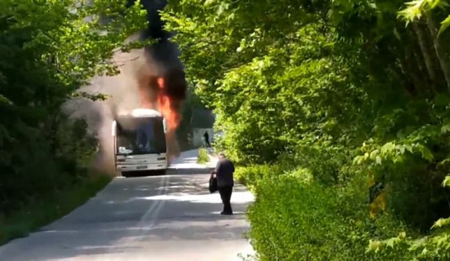 Хората са пътували към град Крушево, когато са усетили лека миризма на пушек. Отбили са автобуса, всички са слезли, а минути по-късно той избухнал в пламъци.