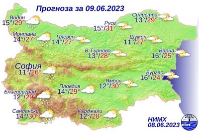 До полунощ явленията навсякъде ще затихнат и купестата облачност ще се размие. През втората половина от нощта ще бъде предимно ясно. Утре ще е предимно слънчево. След обяд над западната половина от страната ще се развие купеста, а над планинските райони и купесто-дъждовна облачност, но само на отделни места ще превали краткотраен дъжд с гръмотевици. Ще духа слаб вятър от североизток. Максималните температури ще бъдат между 26° и 31°, в София около 26°.