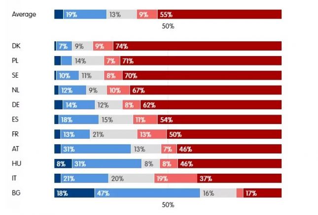 В Полша 39% от анкетираните са готови да прекратят всякакви отношения с Русия дори и след като войната в Украйна свърши. Междувременно мнозинството в България (51%), около една трета от австрийците и унгарците и една четвърт от германците вече обмислят възстановяването на отношения на пълно сътрудничество с Русия след войната. Би било опасно, ако европейските дискусии по този въпрос се водят от тези крайни позиции, смятат от Европейския съвет за външни отношения.