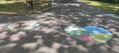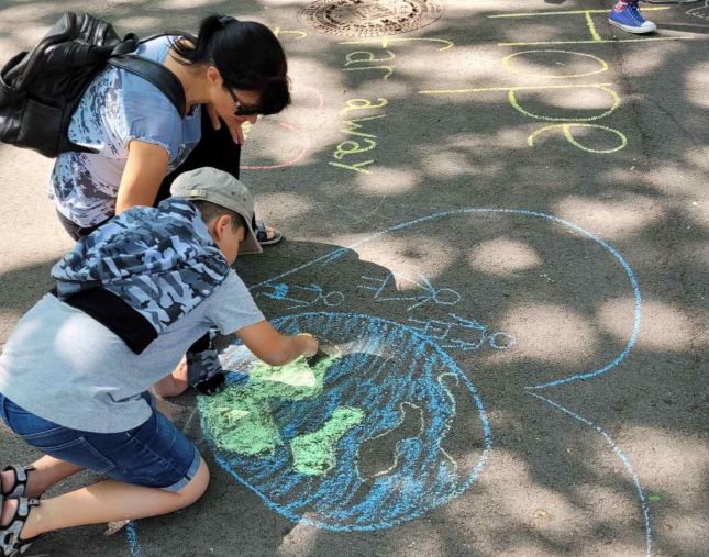На асфалта се появиха сърца и слънца – малки и големи, зелени планети, семейства хванати за ръце, гълъб с маслинова клонка, кола или надпис „мама“.