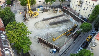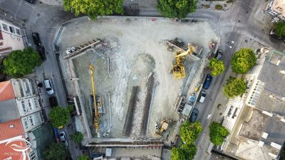 Как изглежда строежът на мястото на съборената градска баня „Гъбата“ показват кадри на дрона „Морско око“ от птичи поглед, научи Moreto.net. Снимките са направени на 17 юни.