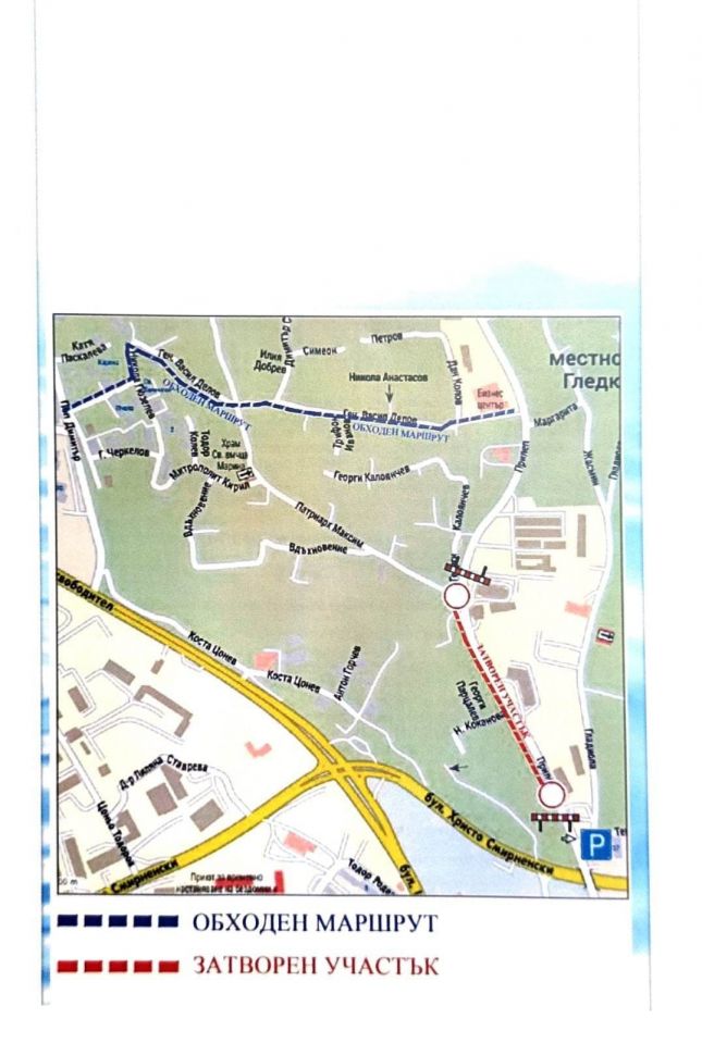 В периода на строителните работи като обходен маршрут може да се използва ул. „Ген. Васил Делов“. Движението на МПС по нея ще е еднопосочно като посоката ще се променя на всеки 10 минути.