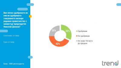 Правителството на Николай Денков стартира с одобрение от 32%, докато 43% не го одобряват. Привържениците на ГЕРБ в по-голямата си част подкрепят кабинета, но една четвърт от тях изразяват неодобрение. Сред гласоподавателите на ПП-ДБ одобрението напълно доминира.