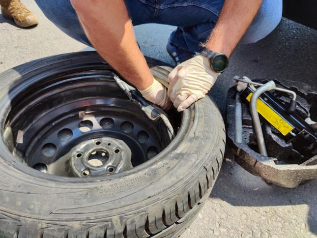 Последвали процесуално-следствени действия, в резултат на които в монтирана на джанта резервна автомобилна гума криминалисти открили четири пакета.
