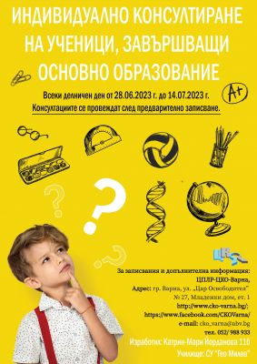 Програмата тази година включва индивидуално консултиране на ученици, завършващи основно образование и техните родители. То ще се провежда всеки делничен ден до 14 юли, от 8 до 16.30 ч. в Младежки дом.