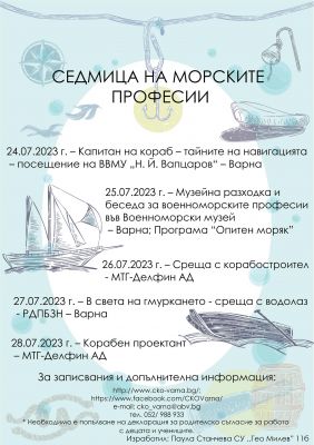 През юли и август малчуганите ще имат възможност да посетят Лятна академия „Опознай професиите“. През последната седмица на юли стартира „Седмица на морските професии“, която цели запознаване с различни морски професии и провокиране на интереса им към тях.