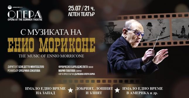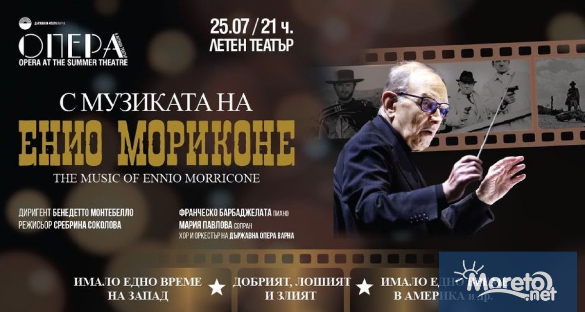 Днес 25 юли Летният театър на Варна ще се изпълни „С музиката на Енио Мориконе“, в изпълнение на оркестъра на Държавна опера Варна, под диригентската палка на Бенедетто Монтебелло, с режисурата на Сребрина Соколова и солистите Франческо Барбаджелата – пиано и Мария Павлова – сопран.