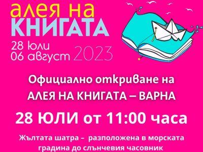 “Алея на книгата” ще бъде официално открита на 28 юли от 11:00 часа на Литературната сцена до слънчевия часовник в Морската градина. На официалната церемония ще присъстват и представители на райони, експерти по културата, духовното развитие, образованието, младежките дейности, много общественици, читатели и автори, сред които ще бъде и Теодора Димова.
