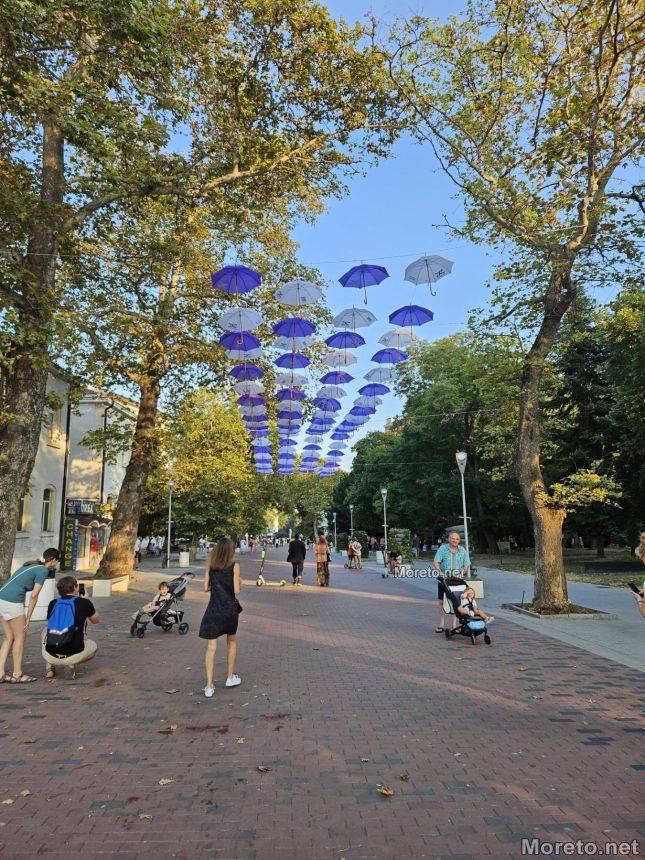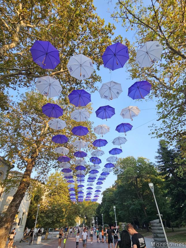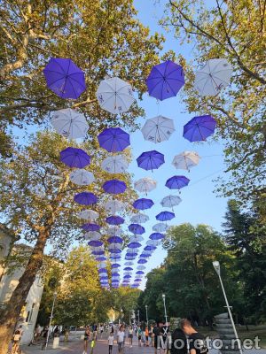 Нова атракция в центъра на града радва отскоро жителите и гостите на Варна. Десетки чадъри, окачени и висящи във въздуха, образуват цветен навес в лилаво и бяло в пешеходната част край сградата на Държавния архив, видя репортер на Moreto.net.