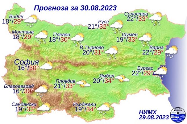От северозапад ще продължи да прониква относително хладен въздух. Температурите ще се понижават и максималните ще са от 26°-27° в северозападните до 34°-35° в югоизточните райони, където вятърът все още ще е от юг; там ще бъде почти без валежи, предимно слънчево.