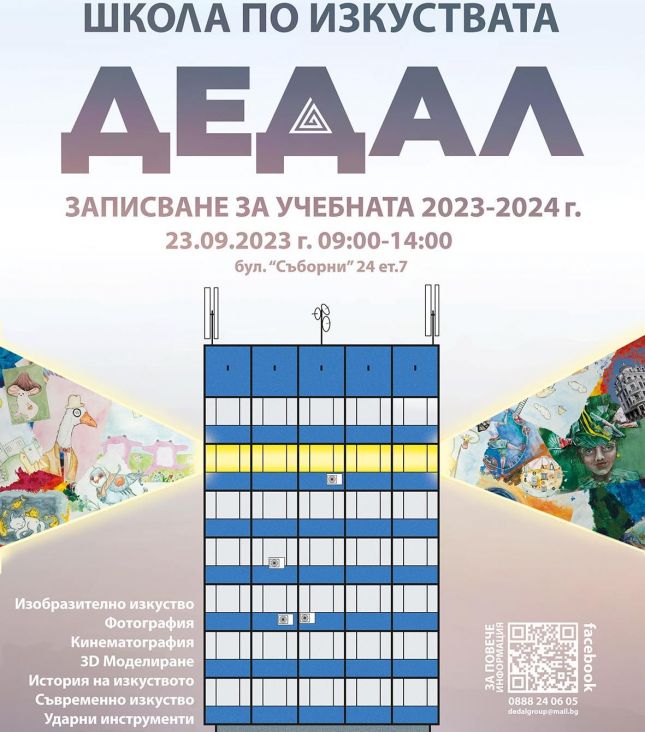 Приемът за предстоящите учебни занятия в школа "Дедал" е на 23 септември, събота, от 9.00 до 13.00 часа в художественото ателие на школата, намиращо се на бул. "Съборни" 24, ет. 7.