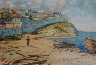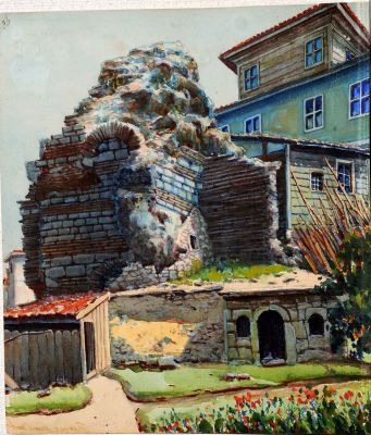 Произведенията му изобразяват останки от Римските терми преди разкопките на археологическия обект. Вижда се входът към църквата „Св. Георги“.