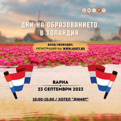 Нидерландските университети ще представят програмите си за обучение в морската столица - ВАРНА на 23 Септември по време на събитието „Дни на образованието в Холандия“. Деветнадесетото изложение, което започва в 10 часа в събота и ще се проведе в хотел „Димят“, се организира от единствения у нас специализиран консултант за образование в Холандия - UNIFY.