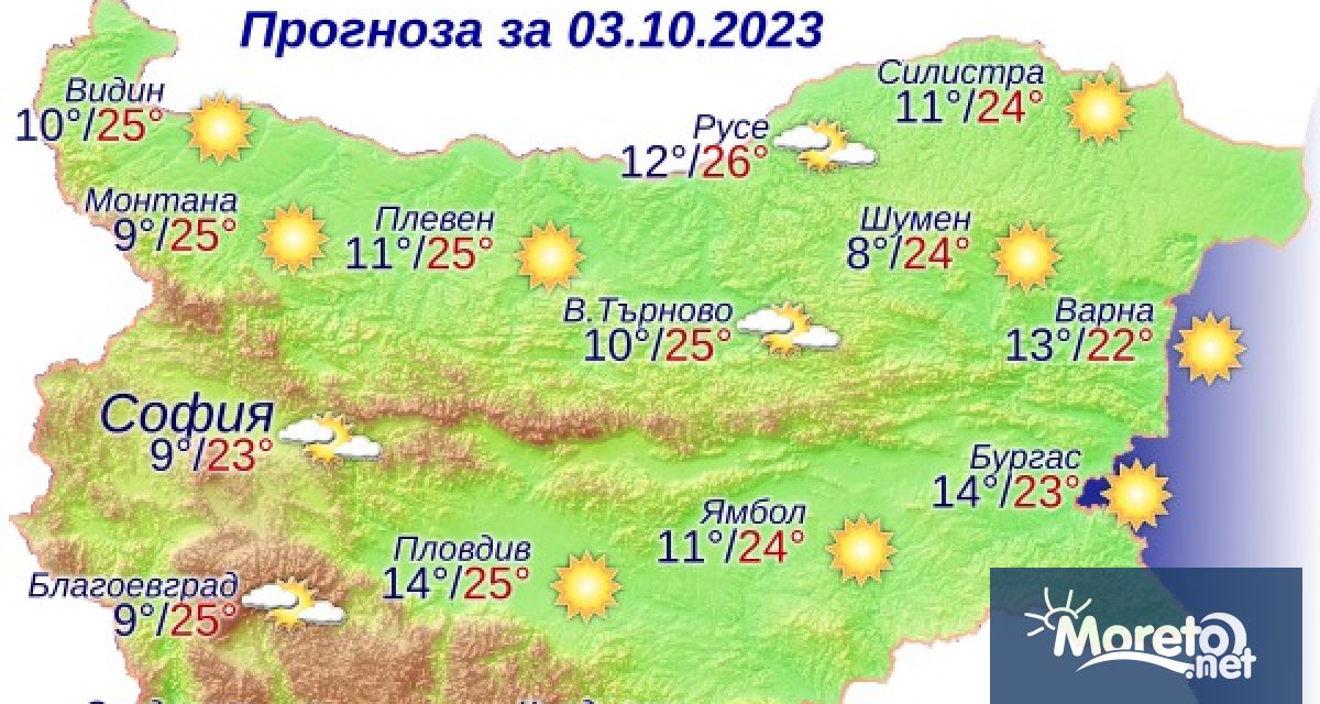 Утре ще бъде предимно слънчево. Вятърът ще се ориентира от изток и ще остане слаб. Максималните температури ще бъдат между 22° и 27°, в София - около 23°.