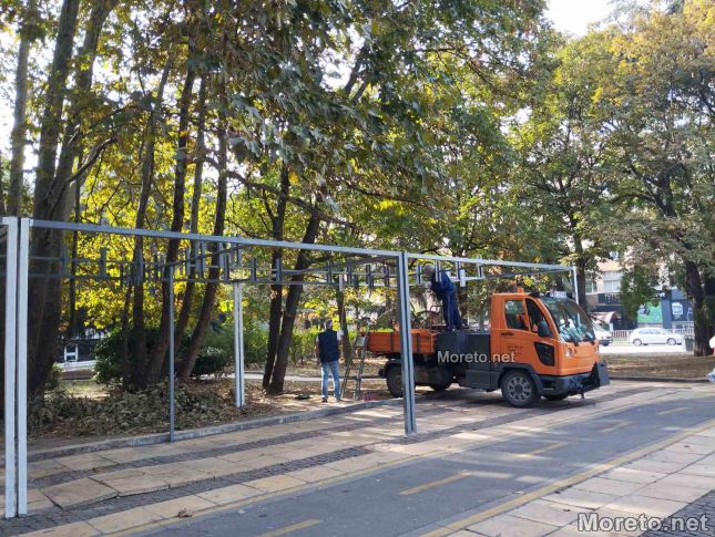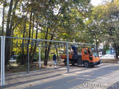 Нова пергола монтират и боядисват в градинката на Червения площад, видя репортер на Moreto.net.