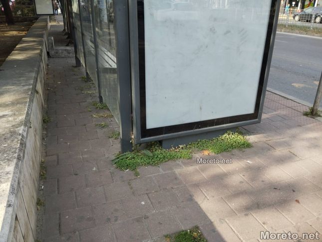 На тротоара до кръстовището цяло лято непокътната стои избуяла трева, каквато често има и зад близките спирки.