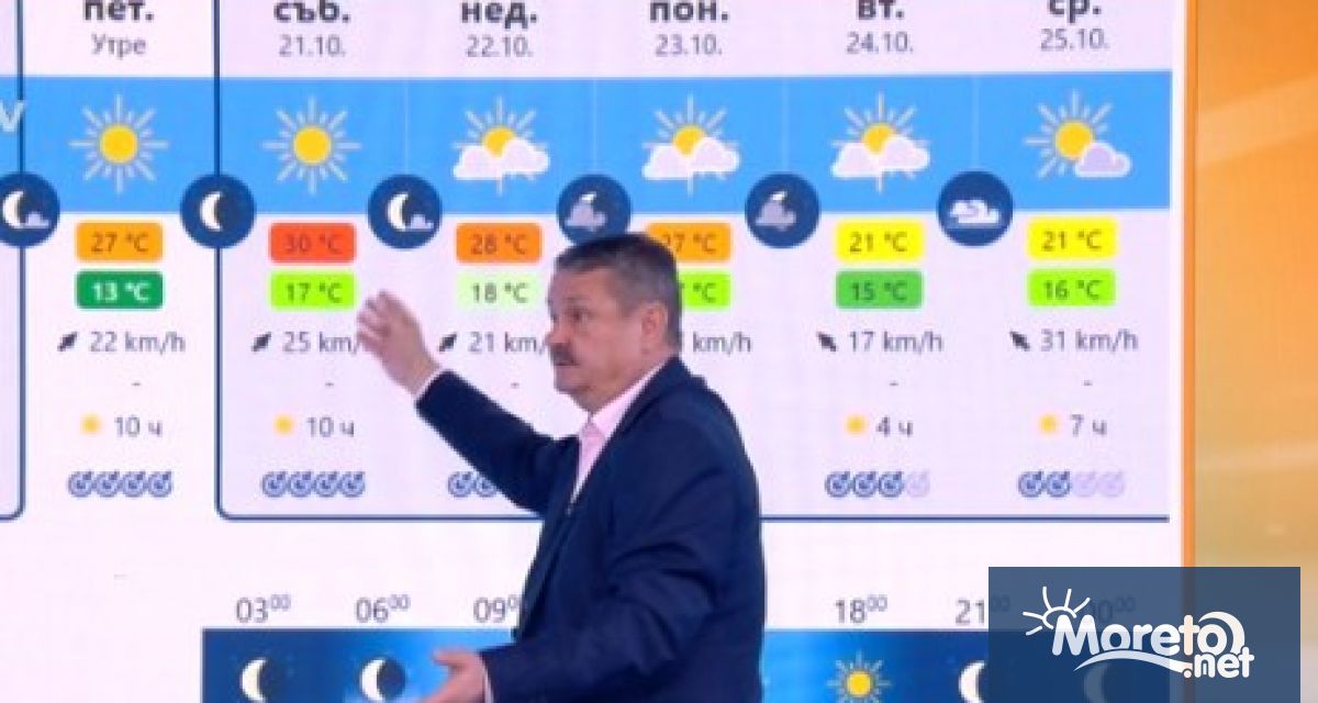 По думите му втората половина на октомври до края на месеца ще бъде много топло. Минималните температури ще бъдат доста високи - около 14-15 градуса.