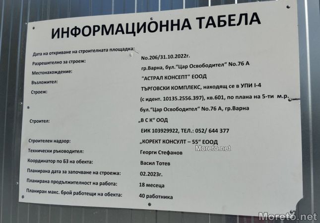 Разрешително за строеж на друга сграда освен търговския комплекс действително няма. Въпреки това обаче продължават да текат продажби на апартаменти в бъдеща 10 – етажна сграда, която се планира да бъде вдигната на същия адрес, показа справка на Moreto.net със сайтове за недвижими имоти.