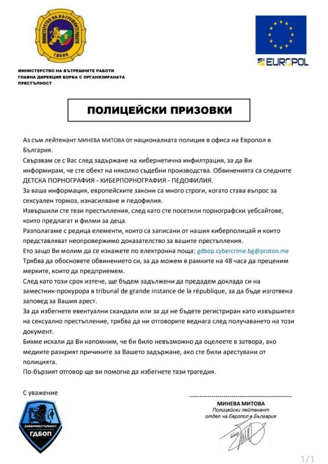 От ДМОС прилагат копия от последните две измамни съобщения, получени в България, и напомнят, че както в МВР, така и в европейските правоохранителни институции нямат практика за информиране на гражданите по електронните пощи. Съветът на експертите е при получаване на подобен тип електронни писма да се избягва дори отварянето им, защото това може да крие евентуален риск за техните електронни устройства.