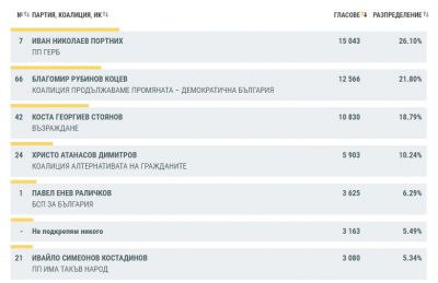 При 57% обработени протоколи: Иван Портних - 26.1%, Благомир Коцев - 21.8%, Коста Стоянов - 18.8%