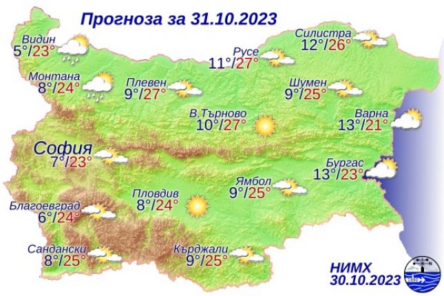 Утре ще е предимно слънчево. В сутрешните часове главно в източните райони ще бъде мъгливо. Около обяд облачността от запад ще започне да се увеличава, ще е предимно висока. Вечерта над Северозападна България облачността ще се вплътни и още преди полунощ на места там ще превали. Ще духа слаб южен вятър. Максималните температури ще са между 22° и 27°, в София - около 23°.