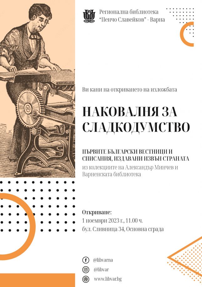 Изложбата „Наковалня за сладкодумство. Първите български вестници и списания, издавани извън страната“ е съчетана с интересни екземпляри от фондовете на библиотеката. От ръчно писани статии до първите типографски издания, експозицията запознава с усилията на българските издатели, писатели, редактори и журналисти, които дават началото на българската преса.