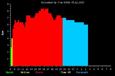 В редки случаи – когато процесът е много интензивен, полярните сияния могат да се наблюдават и от по-ниски географски ширини. Интензивността на потока от заредени частици се оценява по геомагнитния ефект, който тя предизвиква, чрез т.нар планетарен Kp индекс. Това е балометрична (логаритмична) величина, която може да има стойности от 0 до 9 и се определя от множество наземни геомагнитни станции, намиращи се в северното и в южното полукълбо на Земята. Снощи между 16:45 ч. и 18:45 ч. Kp индексът достигна и леко надмина стойност 8, след което започна да спада.