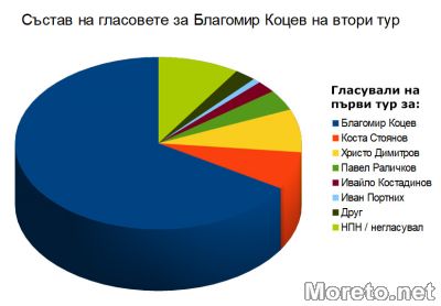 2/3 от гласовете на втори тур за Благомир Коцев са тези, които са изразени в негова подкрепа и на първи тур. Останалата част са разпределени гласове от избирателите, подкрепили вече отпаднали участници от надпреварата на първи тур.