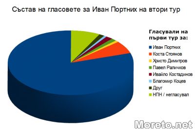 Голяма част от подкрепата за Иван Портних (80%) на втори тур идва от избиратели, гласували за него и на първи тур. Останалата 1/5 от гласовете в негова подкрепа са прелели от отпаднали кандидати.