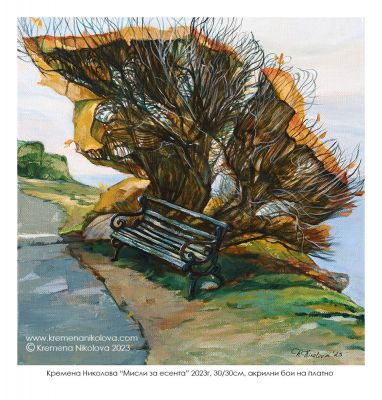 "Тази година лятото се задържа доста дълго, затова решихме изложбата да се казва "Началото на есента". Изучавахме цветовите нюанси и състоянията на есента, експериментирахме, работихме по впечатления. Използвахме различни бързи техники, като туш, пастели, акварел, акрил. Не забравихме обаче и работата с маслени бои. Малките формати ни дадоха възможност да работим бързо и да запечатаме много моменти, по-големите – повече пространство за експерименти. В изложбата ще видите пейзажи от места край Балчик, Калиакра, улици от Варна, алеи в Морската градина, както и фотографски натюрморти сред природата."