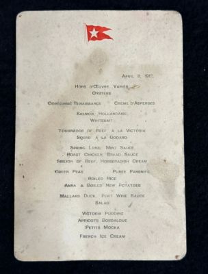 Меню за вечеря в първа класа на кораба достигна цена от 66 000 британски лири. Смята се, че това е единственият оцелял списък с ястия. В него фигурират блюда със стриди, агнешко и зеленоглава патица и филе ала Виктория. Оцелялото от корабокрушението меню е повредено от водата, но въпреки това анонимен купувач плати за него 66 000 британски паунда (81 000 щатски долара) по време на аукциона, организиран от "Хенри Олдридж и син".