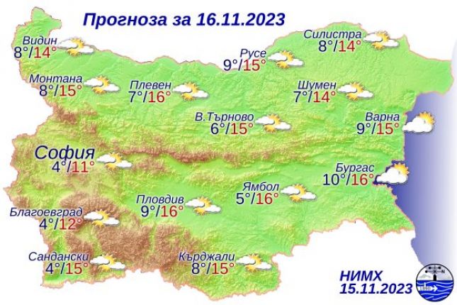 През нощта над Северна България облачността бързо ще намалее до предимно ясно. Над Южна все още ще е значителна и там ще има валежи от дъжд, които до сутринта ще спрат и облачността ще се разкъсва. Ще духа умерен, в Дунавската равнина и Горнотракийската низина временно силен вятър от запад-северозапад. Минималните температури, в повечето райони, ще бъдат между 4° и 9°, в София около 4°. Утре ще е предимно слънчево. Ще продължи да духа умерен вятър от запад-северозапад, но след обяд постепенно ще отслабва. Максималните температури ще бъдат между 11° и 16°, в София около 11°.