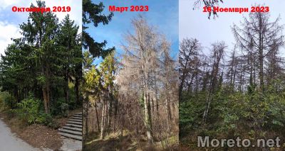 Наблюдавайте добре този колаж (кликнете върху снимката за по-голямо изображение). Кадър 1 е от октомври 2019 г., през март 2023 г. - кадър 2, вече е видимо, че 4 - 5 дървета вляво на стълбите са изсъхнали, а шест месеца по-късно, през ноември 2023 г. - всички дръвчета в близост на първите 4 - 5 са изсъхнали също.