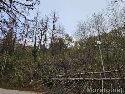 Само по себе си фрапиращо, сега тези допреди 4 години зелени иглолистни дървета, лежат мъртви върху огромен, влачещ се по земята и в момента, високоволтов кабел, захранващ строежа по-долу (да се надяваме, че по него вече не тече ток).