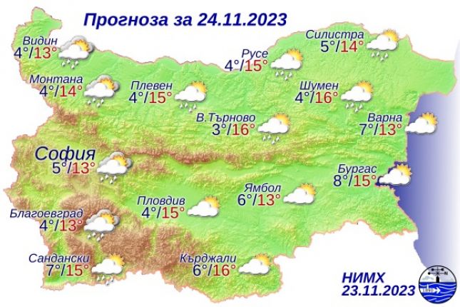 През нощта облачността ще се разкъса. В сутрешните часове на места в низините и котловините видимостта ще е намалена. Ще духа слаб югозападен вятър. Минималните температури ще са между 3° и 8°, в София - около 5°. Утре преди обяд облачността над страната ще е значителна, около и след обяд ще се увеличи и вплътни. От запад-северозапад ще започнат валежи от дъжд. Ще духа слаб, в Източна България - умерен запад-югозападен вятър. С него дневните температури ще се повишат и максималните ще са между 12° и 17°, в София - около 13°.